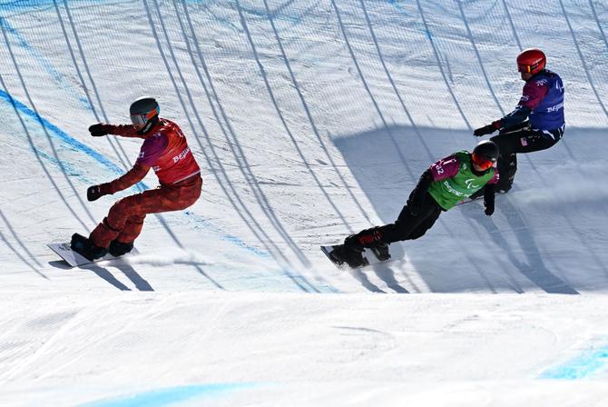 3月7日,中國選手武中偉(中)在北京冬殘奧會單板滑雪男子障礙追逐LL1級比賽中,最終他獲得季軍。新華社記者宋彥樺攝