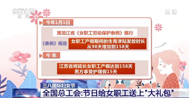 今年1月1日,黑龍江省《女職工勞動(dòng)保護(hù)條例》施行,《條例》規(guī)定女職工產(chǎn)假期間的生育津貼發(fā)放時(shí)長(zhǎng)從98天增加到158天。據(jù)了解,今年,江蘇省將延長(zhǎng)女職工產(chǎn)假達(dá)到158天,男方享受護(hù)理假15天。