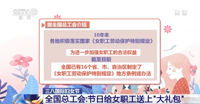 據(jù)全國(guó)總工會(huì)介紹,10年來(lái),各地積極落實(shí)國(guó)家《女職工勞動(dòng)保護(hù)特別規(guī)定》。為進(jìn)一步加強(qiáng)女職工的合法權(quán)益,截至目前,全國(guó)已有16個(gè)省、市、自治區(qū)制定了《女職工勞動(dòng)保護(hù)特別規(guī)定》地方條例或辦法。