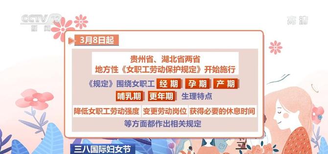 從3月8日起,貴州省、湖北省兩省地方性《女職工勞動(dòng)保護(hù)規(guī)定》開始施行?!兑?guī)定》圍繞女職工經(jīng)期、孕期、產(chǎn)期、哺乳期、更年期的生理特點(diǎn),在降低女職工勞動(dòng)強(qiáng)度、變更勞動(dòng)崗位、獲得必要的休息時(shí)間等方面都作出相關(guān)規(guī)定。今年1月1日,黑龍江省《女職工勞動(dòng)保護(hù)條例》施行,《條例》規(guī)定女職工產(chǎn)假期間的生育津貼發(fā)放時(shí)長(zhǎng)從98天增加到158天。據(jù)了解,今年,江蘇省將延長(zhǎng)女職工產(chǎn)假達(dá)到158天,男方享受護(hù)理假15天。