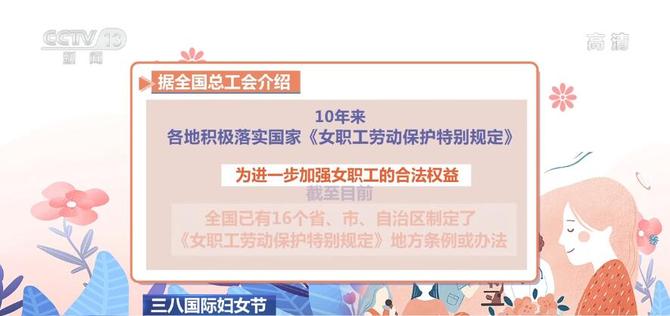 據(jù)全國(guó)總工會(huì)介紹,10年來,各地積極落實(shí)國(guó)家《女職工勞動(dòng)保護(hù)特別規(guī)定》,為進(jìn)一步加強(qiáng)女職工的合法權(quán)益。截至目前,全國(guó)已有16個(gè)省、市、自治區(qū)制定了《女職工勞動(dòng)保護(hù)特別規(guī)定》地方條例或辦法。