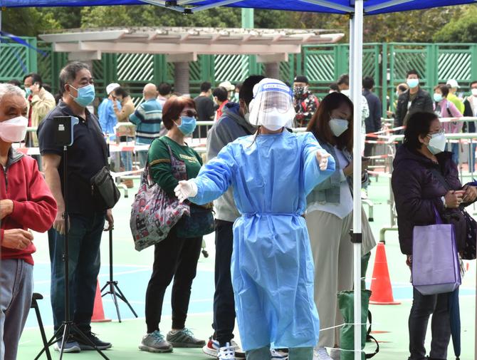 3月7日,在香港馬鞍山流動檢測站,工作人員引導市民做核酸檢測。新華社記者 盧炳輝 攝