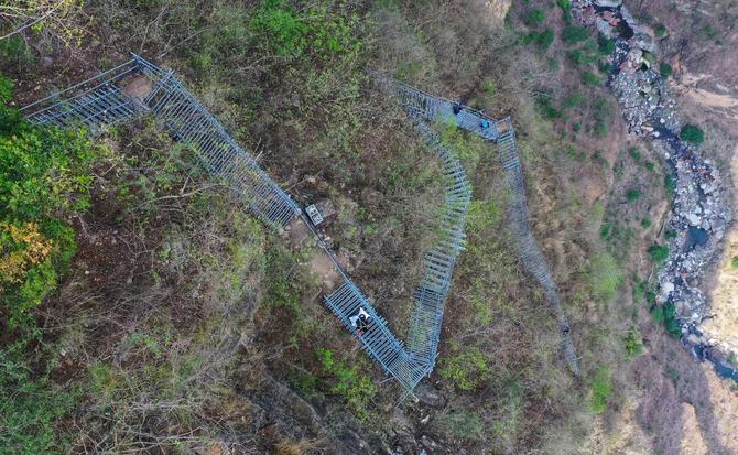 在四川涼山彝族自治州昭覺縣阿土列爾村的懸崖鋼梯上,“懸崖村”村民沿著鋼梯下山(2020年5月13日攝,無人機(jī)照片)。新華社記者 王曦 攝