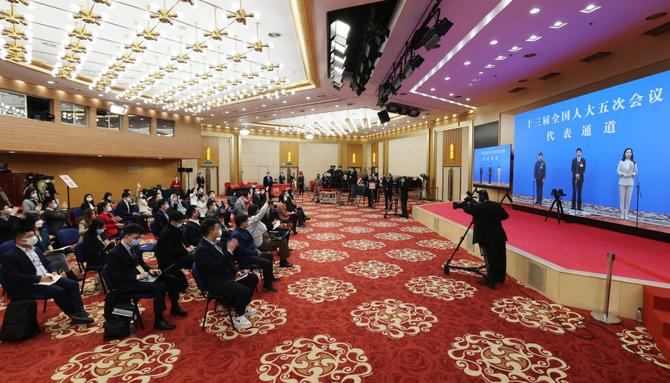 3月8日,第十三屆全國人民代表大會(huì)第五次會(huì)議舉行第二場“代表通道”采訪活動(dòng)。這是記者在分會(huì)場通過網(wǎng)絡(luò)視頻方式采訪。新華社記者 殷剛 攝