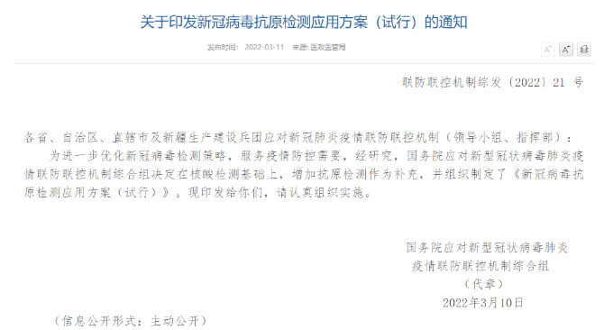 此前,國(guó)家衛(wèi)生健康委員會(huì)發(fā)布通知,表示決定在核酸檢測(cè)基礎(chǔ)上,增加抗原檢測(cè)作為補(bǔ)充,并組織制定了《新冠病毒抗原檢測(cè)應(yīng)用方案(試行)》。
