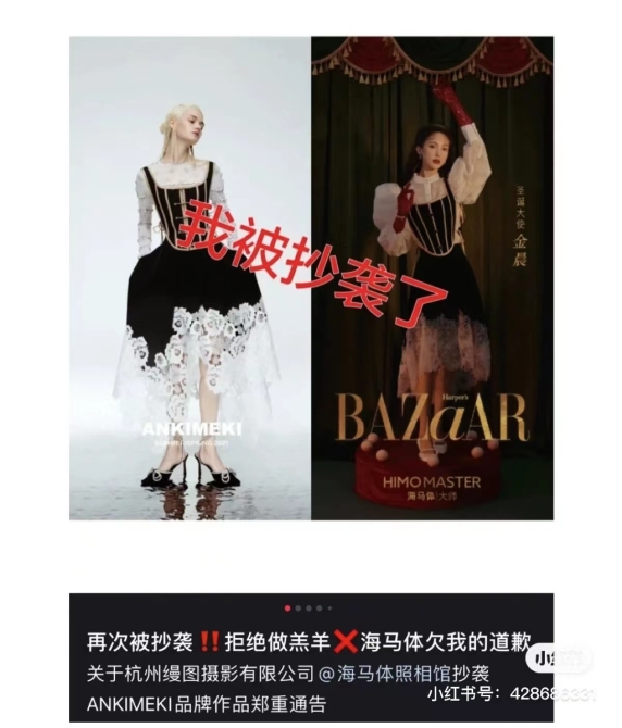 譬如2022年新年照“未央”,提供的漢服是漢服品牌十三余推出的牛年款,“虎年新年照穿的全是牛元素衣服不奇怪嗎?”,一位小紅書(shū)用戶如是寫(xiě)道;相隔不遠(yuǎn)的2021年圣誕照之“圣誕lady”,因復(fù)古風(fēng)格受到不少女性喜愛(ài),然而隨即則被小眾設(shè)計(jì)師品牌@ANKIMEKI發(fā)現(xiàn)服裝與自己品牌產(chǎn)品高度相同、涉嫌抄襲,最終該款產(chǎn)品暫停售賣(mài)。
