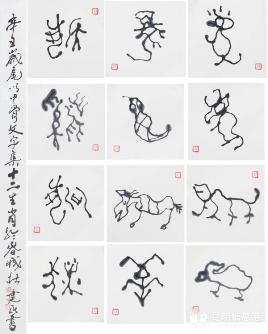 此外,杜建民先生還十分注重師法造化,足跡幾遍滇云,此次展出的《玉龍雪山》《人字橋》,意境新奇,遠近布局相連相應,其幽深、蒼茫的韻味充盈畫面,體現(xiàn)出一種積極向上的情懷?!妒ぁ?,是杜建民先生以甲骨文字寫成的作品,稚拙可愛,用筆變化多姿,線條溫潤,極富金石之味。