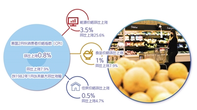 美國勞工部3月10日公布的數(shù)據(jù)顯示,美國2月份居民消費(fèi)價格指數(shù)(CPI)環(huán)比上漲0.8%,同比上漲7.9%,創(chuàng)1982年1月以來最大同比漲幅。美國2月份CPI環(huán)比和同比漲幅均較1月份明顯擴(kuò)大,表明美國通脹率繼續(xù)強(qiáng)勢上揚(yáng),美聯(lián)儲之前的分析預(yù)判和有關(guān)降溫措施不夠精準(zhǔn)有力。美國面臨兩難抉擇,既想確保經(jīng)濟(jì)增長,又要抑制通脹,通脹率在年內(nèi)實現(xiàn)軟著陸目標(biāo)難度較大。