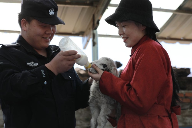 民警和牧民一起喂剛出生的小羊羔吃奶。(受訪者供圖)