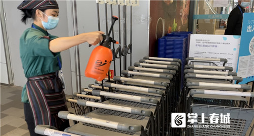 賣場外,保潔人員馬賢信正手提消毒噴壺對賣場外的購物車購物籃進行噴灑消毒。“我主要負責(zé)全場的消殺工作,主入口、次入口的購物籃購物車,人流量較大的過道,電梯按鈕、門簾等一切顧客最容易接觸到的區(qū)域都會重點消殺。”