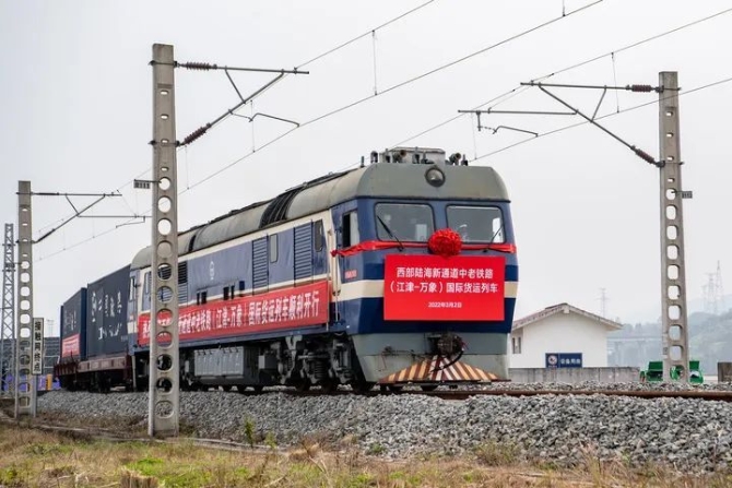 2022年3月2日,中老鐵路(江津–萬象)國際貨運(yùn) 首發(fā)列車從重慶小南埡鐵路物流中心駛出 唐奕攝 / 本刊