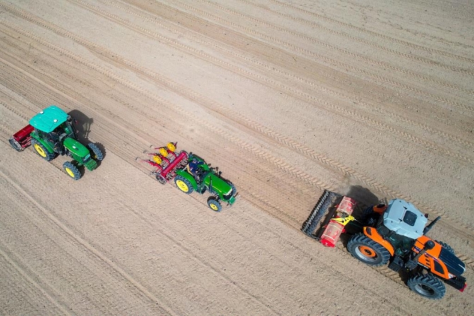 △2022年3月,寧夏吳忠,運用北斗導航無人駕駛播種技術(shù),紅寺堡鎮(zhèn)一生產(chǎn)基地開展滴灌節(jié)水千畝春小麥播種。