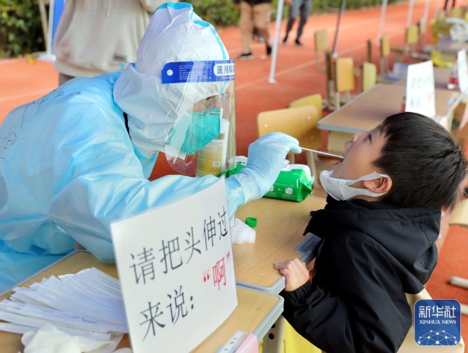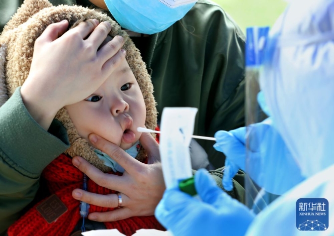 3月19日,一名1歲多的小朋友在媽媽幫助下接受核酸采樣。