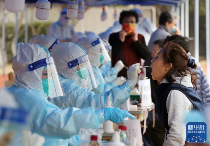 3月19日,檢測人員為上??党蔷用襁M(jìn)行核酸采樣。