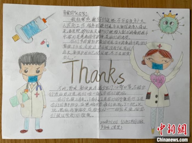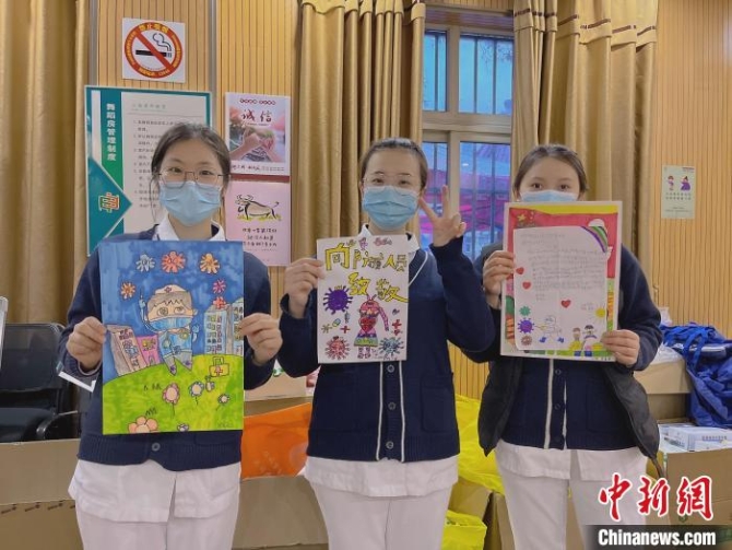 小朋友寫(xiě)信、繪畫(huà)贈(zèng)第二組“紫荊社區(qū)”醫(yī)護(hù)人員 上海孟超腫瘤醫(yī)院供圖