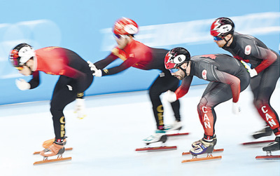 2月11日,北京2022年冬奧會短道速滑項目男子5000米接力半決賽在首都體育館舉行。圖為加拿大隊隊員查爾斯·哈梅林(右二)在比賽中。新華社發(fā)