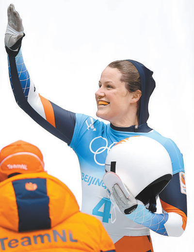 2月12日,北京2022年冬奧會女子鋼架雪車比賽在國家雪車雪橇中心舉行。圖為獲得季軍的荷蘭選手金伯莉·博斯在賽后致意。新華社發(fā)