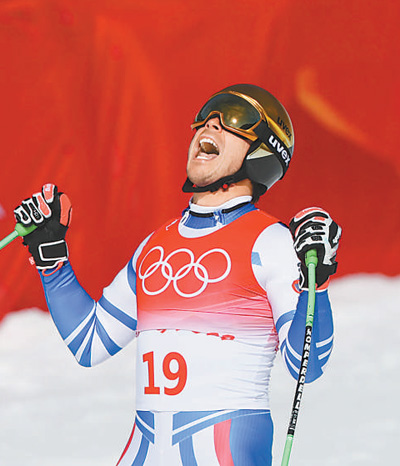 2月7日,北京2022年冬奧會高山滑雪男子滑降項目比賽在延慶國家高山滑雪中心舉行。圖為獲得亞軍的法國選手約翰·克拉雷在賽后慶祝。新華社發(fā)