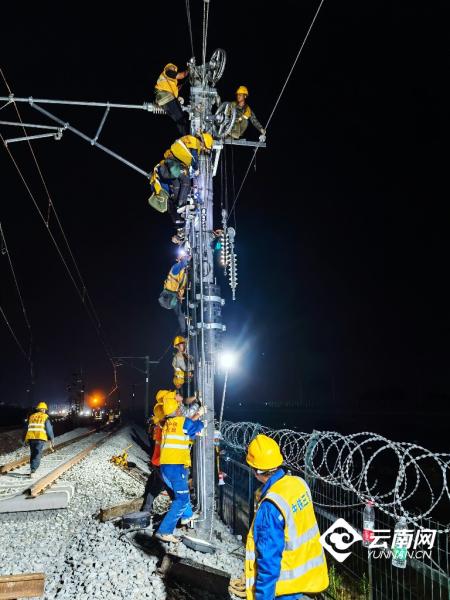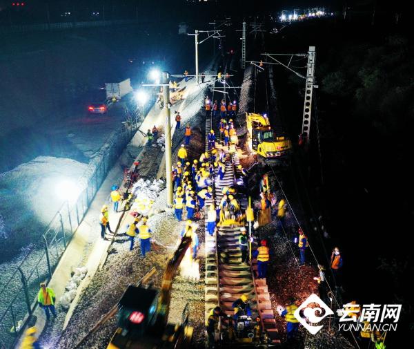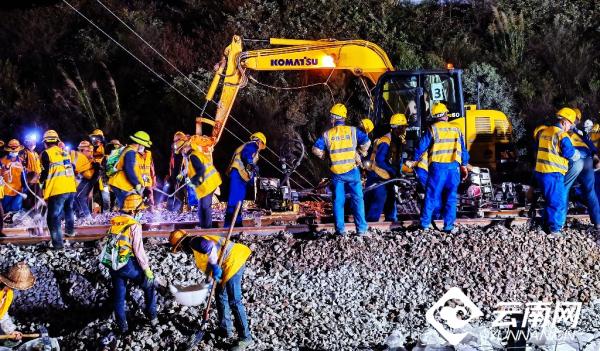 “今天晚上施工是多單位、多工種、 多工序的聯(lián)合施工, 三個(gè)龍口同時(shí)進(jìn)行撥接,戰(zhàn)線長(zhǎng)、難度大、安全風(fēng)險(xiǎn)高。” 忙碌穿梭于各施工點(diǎn)的王志軍說(shuō),昆明局集團(tuán)組織中鐵三局等施工單位,結(jié)合現(xiàn)場(chǎng)實(shí)際,超前謀劃,制定了應(yīng)急措施和針對(duì)性的實(shí)施方案,投入大型機(jī)械9臺(tái)、挖掘機(jī)12臺(tái) ,全力攻堅(jiān)會(huì)戰(zhàn)。次日凌晨4點(diǎn),所有工序全部完成,線路達(dá)到運(yùn)行條件。