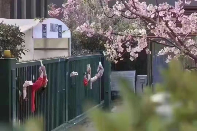 有朋友給記者轉(zhuǎn)發(fā)來(lái)了這張照片:“滿園春色”已經(jīng)開(kāi)放,暫時(shí)被封閉管理的小區(qū)里,數(shù)只手機(jī)“出墻來(lái)”。人們不希望春光獨(dú)自溜走,于是更加配合地選擇“同向而行”。他轉(zhuǎn)發(fā)后說(shuō),“上海還是一個(gè)有腔調(diào)的地方”。