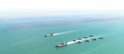在山東省榮成市愛倫灣海域,養(yǎng)殖工人駕駛滿載江蘺的舢板駛向碼頭。王福東攝(影像中國)