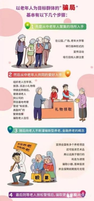 投資理財要謹(jǐn)慎。不法商家瞄準(zhǔn)老年人的退休金與養(yǎng)老金,利用老年人信息不對稱等弱點(diǎn),捏造虛假金融項(xiàng)目,拋出高利率誘惑,致使老年人放松警惕,上當(dāng)受騙。