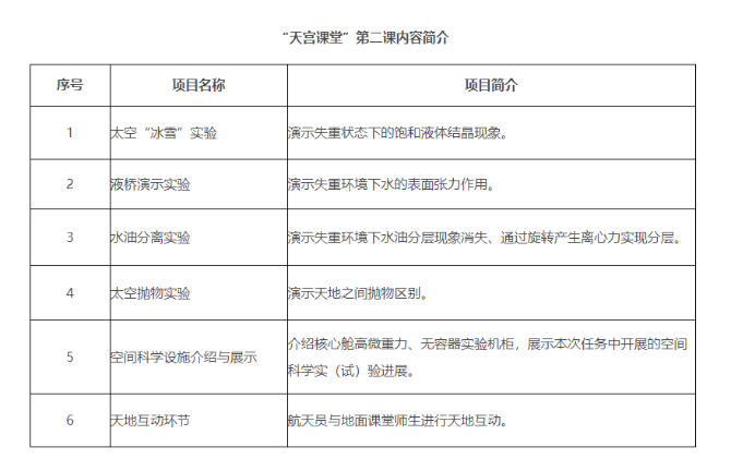 本次太空授課活動繼續(xù)采取天地對話方式進行,由航天員在軌演示太空“冰雪”實驗、液橋演示實驗、水油分離實驗、太空拋物實驗,介紹與展示空間科學設(shè)施(授課內(nèi)容介紹附后),旨在傳播普及空間科學知識,激發(fā)廣大青少年不斷追尋“科學夢”、實現(xiàn)“航天夢”的熱情。