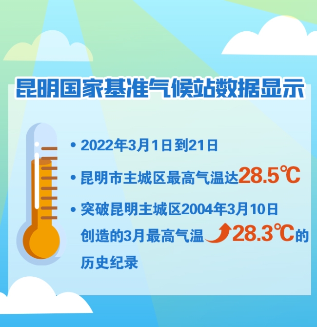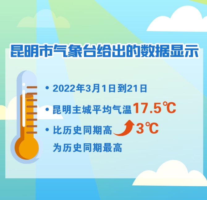 根據(jù)昆明市氣象臺給出的數(shù)據(jù),2022年3月1日到21日昆明主城平均氣溫17.5℃,比歷史同期高3℃,為歷史同期最高。
