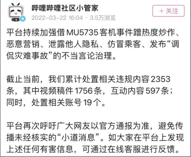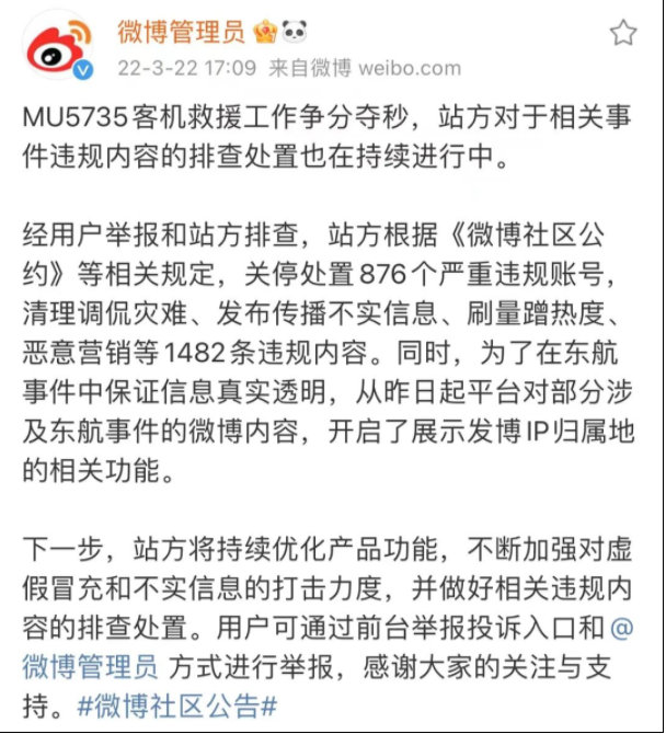 同日,@微博管理員 發(fā)布通告,①關(guān)停處置876個(gè)嚴(yán)重違規(guī)賬號(hào);②清理1482條違規(guī)內(nèi)容;③對(duì)部分涉及東航事件的微博內(nèi)容,開啟了展示發(fā)博IP歸屬地的相關(guān)功能。