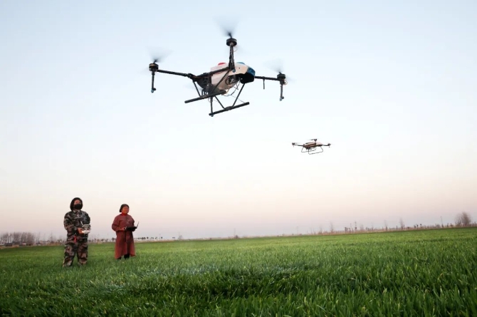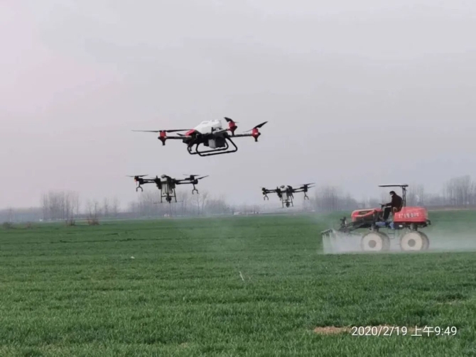 工作人員利用植保無人機(jī)和陸地自走植保機(jī)開展聯(lián)合作業(yè),對麥田進(jìn)行農(nóng)藥噴灑。圖:盧俞 文:劉勝