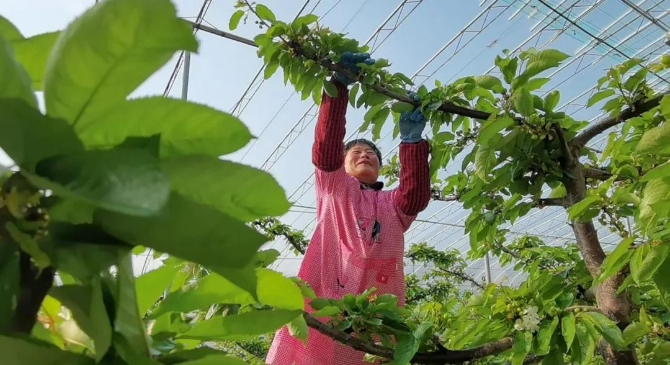 2月5日,山東省煙臺市福山區(qū)門樓街道西汪格莊弘基山莊農(nóng)戶在大櫻桃棚里進(jìn)行生產(chǎn)管理。圖 申吉忠
