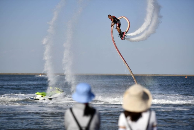 2021年6月5日,游客在天津市濱海新區(qū)東疆港人工沙灘觀看水上特技表演 ( 趙子碩/攝 )