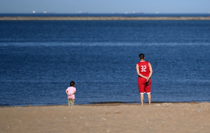 2021年6月5日,在天津市濱海新區(qū)東疆港人工沙灘,家長和小朋友一起背手望向大海(李然/攝)