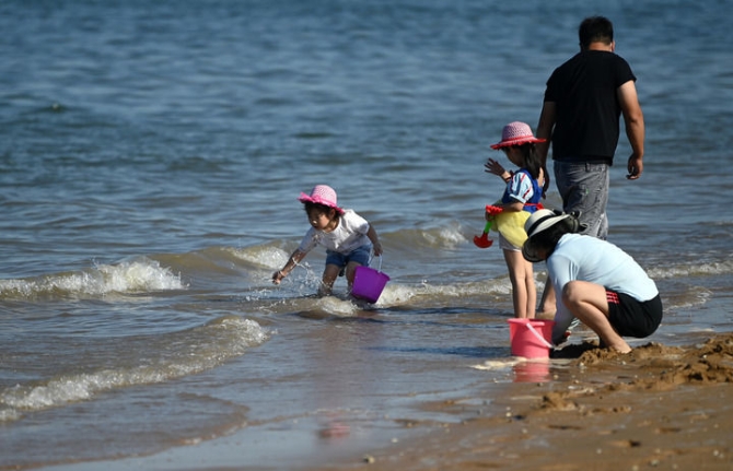 2021年6月5日,在天津市濱海新區(qū)東疆港人工沙灘,小朋友在家長的陪伴下“趕海拾貝”(李然/攝)