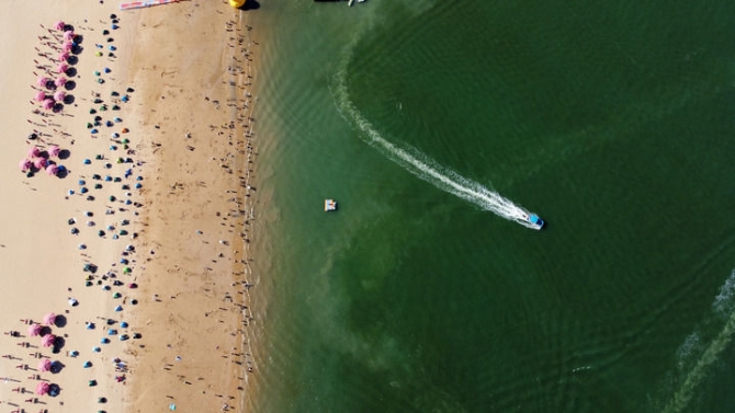 2021年6月5日,游客在天津市濱海新區(qū)東疆港人工沙灘游玩(無人機(jī)照片,趙子碩/攝)