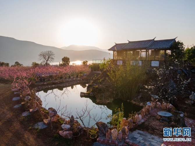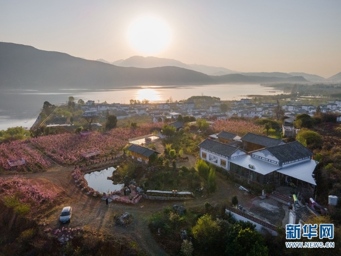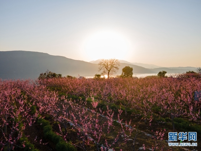 洱源縣茈碧湖畔,千樹桃花烘日出(攝于3月18日)。新華網(wǎng)發(fā)(羅新才/攝)