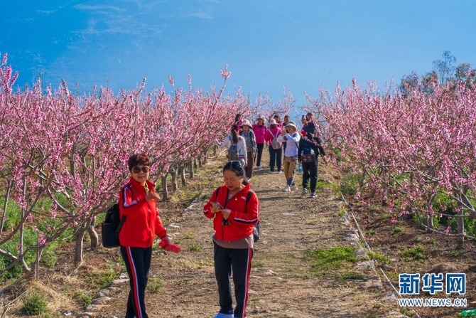 洱源縣茈碧湖鎮(zhèn)??诖逦瘯贍I村,游客在桃園里游玩(攝于3月18日)。新華網(wǎng)發(fā)(羅新才/攝)