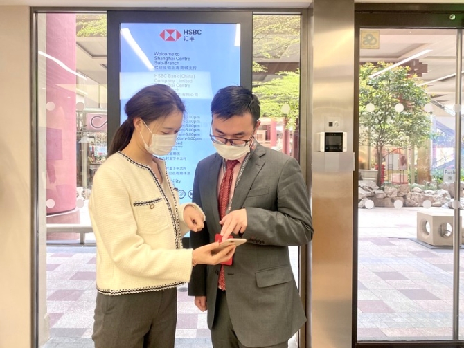 3月24日,匯豐上海商城支行員工在討論當日工作安排。網點在滿足防疫的要求下,繼續(xù)保持正常運轉,并確保手機銀行的穩(wěn)定服務。受訪者供圖
