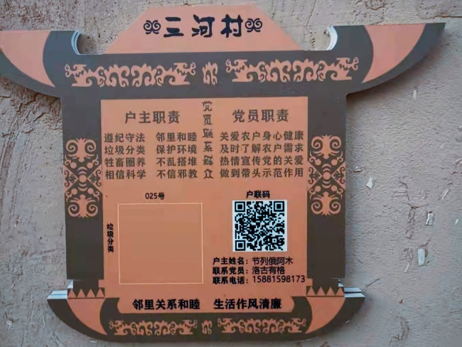 “我們把‘戶聯(lián)碼’引入了三河村,以三河村家庭為單位,給每戶農(nóng)戶建立一個‘戶聯(lián)碼’,并張貼于農(nóng)戶家門口?!睋?jù)浙江援川掛職干部、寧波余姚駐昭覺工作組成員、昭覺政府辦副主任鄔海濱介紹,“戶聯(lián)碼”系統(tǒng)承載了農(nóng)戶家庭的多種信息,也內(nèi)置了多種應用可與村委、其他村民及游客進行在線互動。