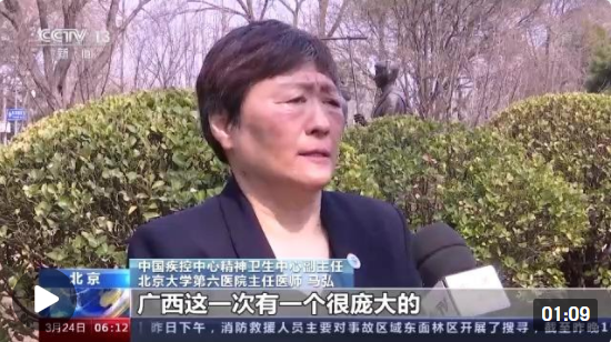 中國疾控中心精神衛(wèi)生中心副主任,北京大學第六醫(yī)院主任醫(yī)師 馬弘:廣西這一次有一個很龐大的心理救援隊在前方,這也是咱們國家派出特別快,人數(shù)非常多,速度非??斓囊淮?。
