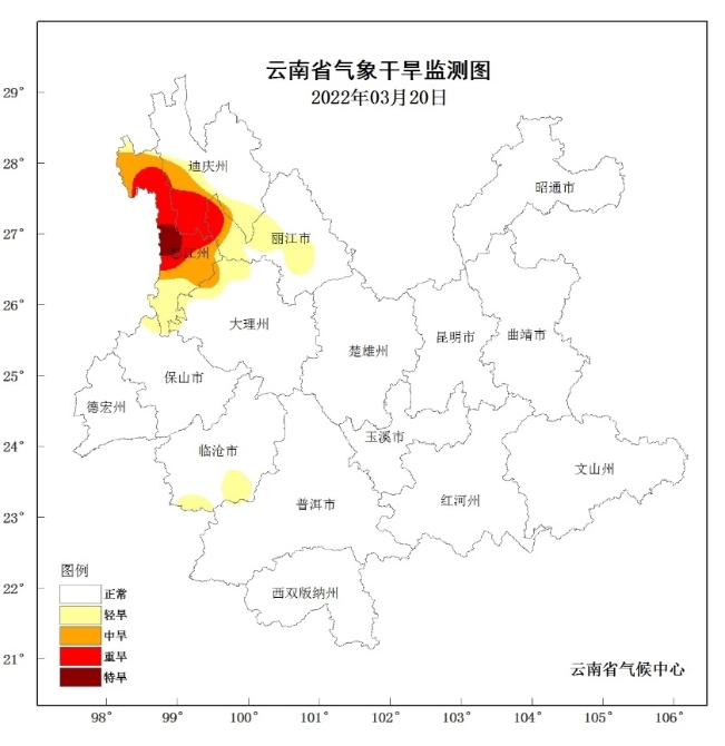 由于氣溫偏高,降水偏少,滇西北等地氣象干旱發(fā)展較快,據(jù)氣象部門3月23日監(jiān)測(cè),全省有13個(gè)站點(diǎn)(占全省10%)出現(xiàn)氣象干旱,其中5站為輕旱,4站為中旱、2站為重旱、2站為特旱,重特旱主要是分布在迪慶州南部、怒江州中大部。