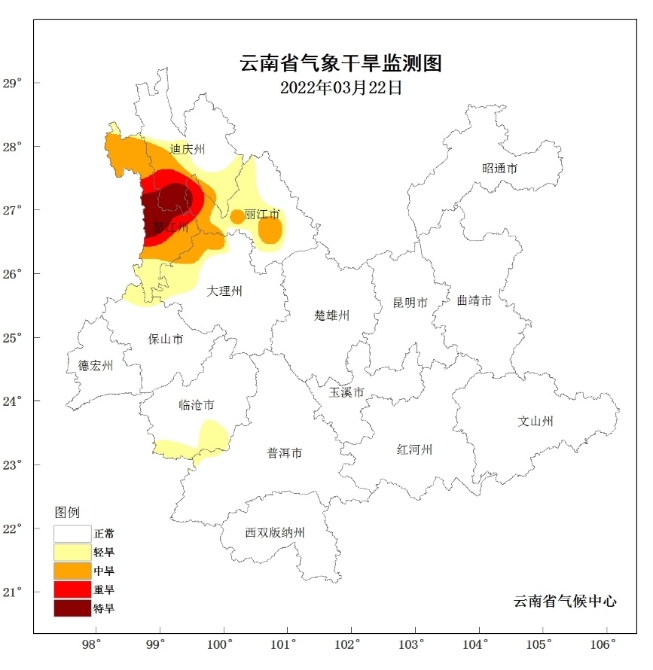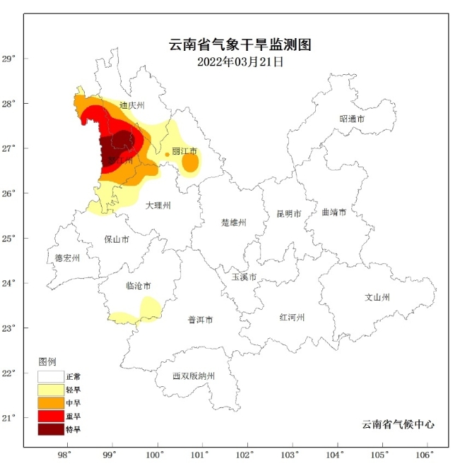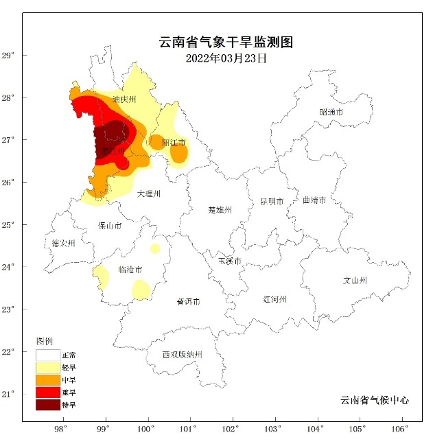 由于氣溫偏高,降水偏少,滇西北等地氣象干旱發(fā)展較快,據(jù)3月23日監(jiān)測(cè),全省有13個(gè)站點(diǎn)(占全省10%)出現(xiàn)氣象干旱,其中5站為輕旱,4站為中旱、2站為重旱、2站為特旱,重特旱主要是分布在迪慶州南部、怒江州中大部。
