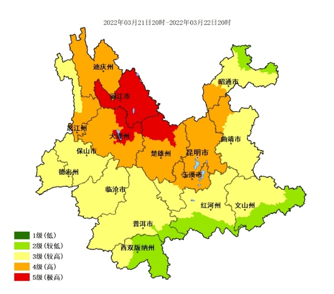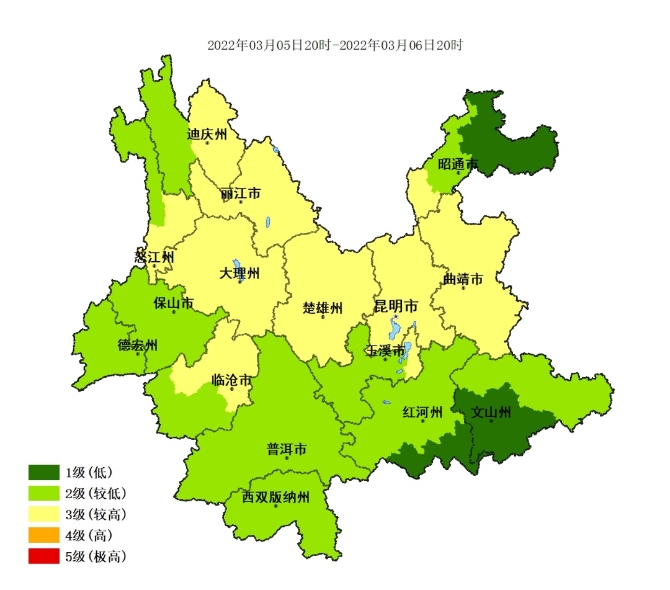 麗江、大理東北部、楚雄北部為5級(jí)(極高),迪慶、怒江南部、大理西部和南部、楚雄中南部、昆明、玉溪北部、曲靖西部、昭通南部4級(jí)(高),其他地區(qū)為2~3級(jí)。