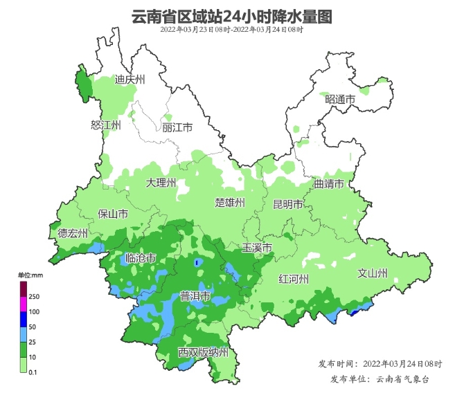 2022年3月23日08時(shí)至24日08時(shí)實(shí)況:文山南部、紅河中南部、玉溪南部、西雙版納、普洱、臨滄、德宏南部、保山南部出現(xiàn)中到大雨局部暴雨,昭通、曲靖北部、麗江、迪慶西部、大理北部多云,其他地區(qū)有陣雨局部中雨。