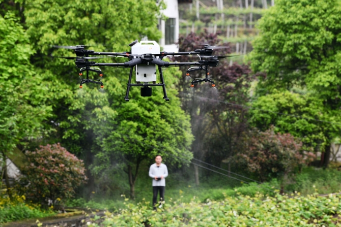 在貴州省貴陽(yáng)市息烽縣小寨壩鎮(zhèn)紅巖村,農(nóng)技人員在葡萄基地進(jìn)行無(wú)人機(jī)植保作業(yè)(2021年4月17日攝)。新華社記者 楊文斌 攝