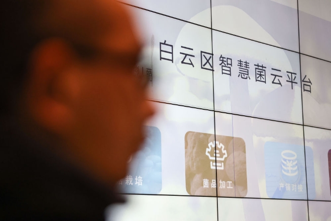工作人員在貴陽(yáng)市白云區(qū)食用菌產(chǎn)業(yè)示范園智能菇房?jī)?nèi)查看菌菇生長(zhǎng)情況(2月14日攝)。新華社記者 歐東衢 攝