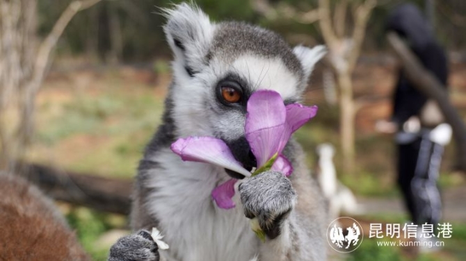 來自馬達(dá)加斯加的環(huán)尾狐猴,平時主要以樹葉、花、果實(shí)以及昆蟲為食,這次鮮花宴它們特別喜歡茉莉花、大白花和花生芽。只見他們圍坐一團(tuán),雙手拿起鮮花就優(yōu)雅吃起來。