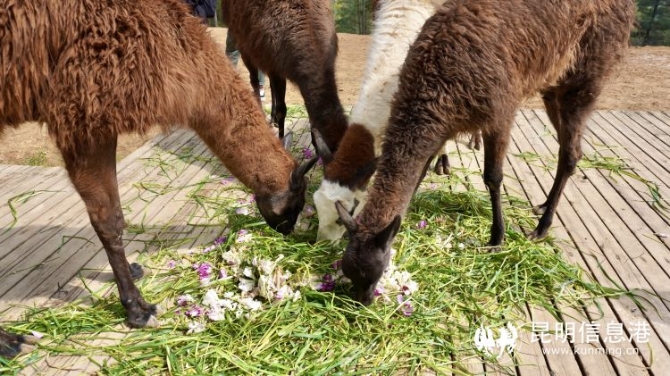 食草二區(qū)生活著駝羊、梅花鹿、麋鹿,當(dāng)鮮花放進(jìn)青草堆里會是怎樣的新奇體驗(yàn)?zāi)??只見喂食臺上鋪滿了鮮花和青草,駝羊和梅花鹿走起小碎步,來到喂食臺開始享用鮮花大餐。
