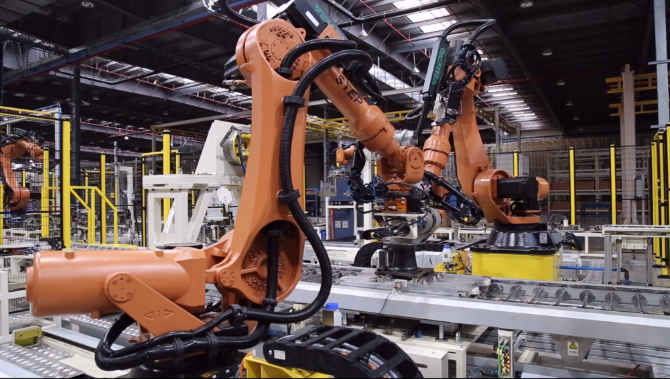在新時(shí)達(dá)機(jī)器人超級(jí)工廠,兩臺(tái)機(jī)器人正在裝配一臺(tái)焊接機(jī)器人本體。(受訪者供圖)