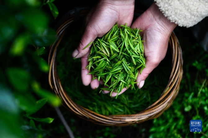 3月29日,貴定縣云霧鎮(zhèn)鳥王村的茶農(nóng)展示春茶。
